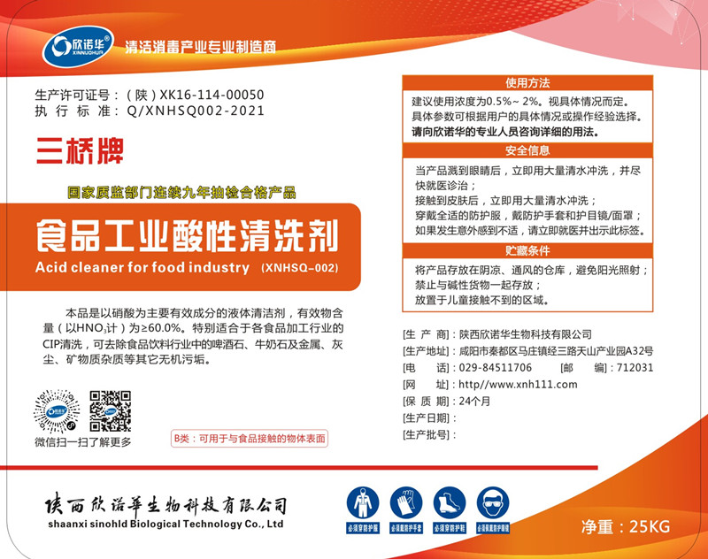 1.三橋牌食品工業(yè)酸性清洗劑(XNHHSQ-2型)是一種無(wú)色或淡黃色透明、無(wú)泡、濃縮的液體高效酸性清洗劑,能強(qiáng)力去除頑固復(fù)雜的礦物質(zhì)污垢、乳垢,在堿性清洗完成后,用它作為酸性清洗劑,能有效防止奶石、石灰質(zhì)及其他礦物質(zhì)污垢的積聚。