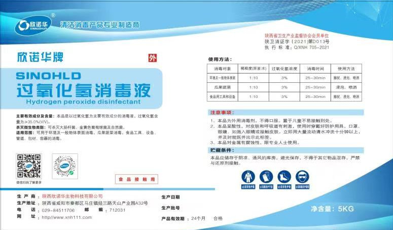 欣諾華牌8%過氧化氫消毒液陜衛(wèi)消證字2021第D013號 執(zhí)行標準:Q/XNH705-2020 二:產(chǎn)品簡介及產(chǎn)品特點: 產(chǎn)品簡介:欣諾華牌8%過氧化氫消毒液是以過氧化氫為主要有效成分的液體消毒劑,有效成份含量為8.0%,可快速。徹底殺滅大腸桿菌,金黃色葡萄球菌。特別適合用于環(huán)境及一般物體表面的消毒,織物消毒