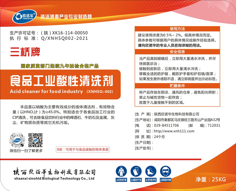 陜西欣諾華生物科技有限公司是生產(chǎn)食品級(jí)硝酸(三橋牌食品工業(yè)酸性清洗劑)的專(zhuān)業(yè)廠(chǎng)家,生產(chǎn)許可證號(hào):陜XK16-114-00050有效成份為35~60%,特別適合用于食品、飲料、乳品、啤酒等行業(yè)設(shè)備,容器、管道的CIP清洗使用。