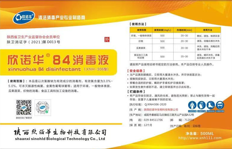 陜西欣諾華生物科技有限公司技術(shù)部提供產(chǎn)品名稱: 欣諾華牌84消毒液 商標:欣諾華衛(wèi)生許可證號:陜衛(wèi)消證字(2021)第D013號 執(zhí)行標準: Q/SQJH306-2020 主要成分及含量:本品是以次氯酸鈉為主要有效成分的消毒液,含量(以有效氯計) 3.0~5.0% ??蓺缒c道致病菌、化膿性球菌。