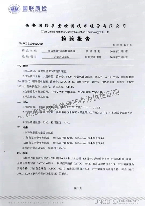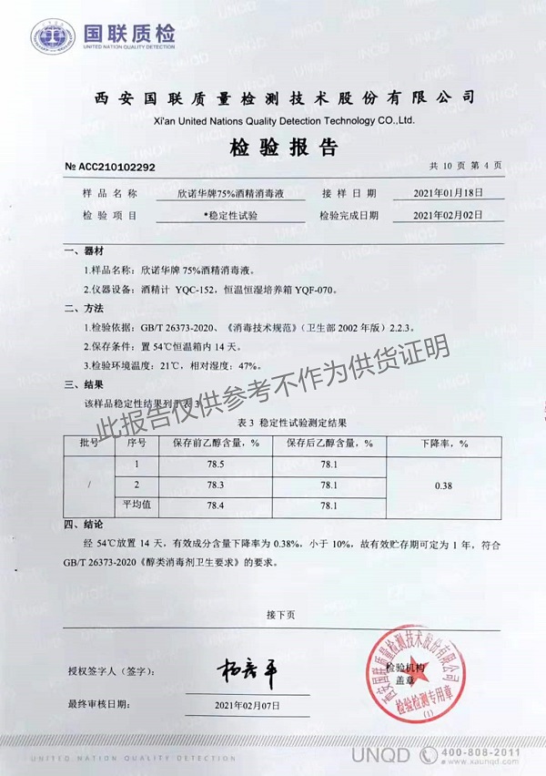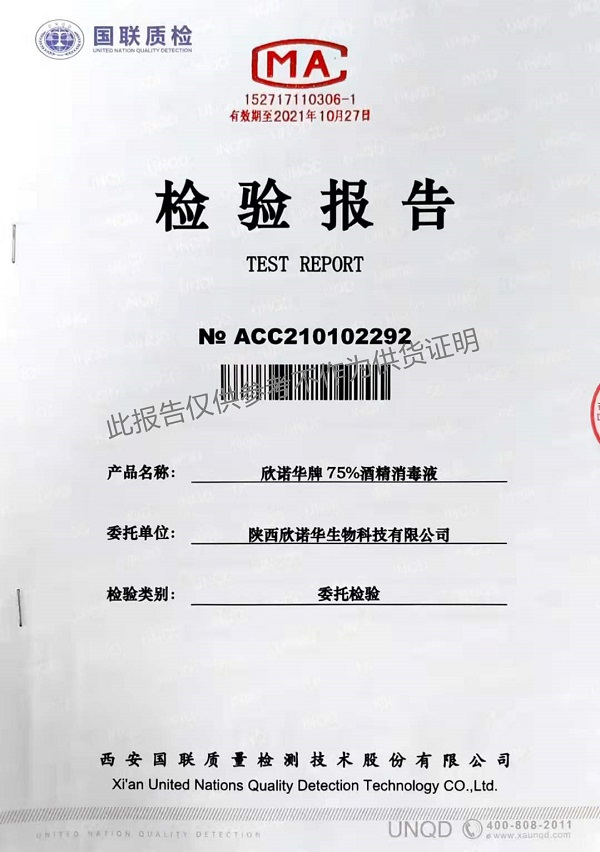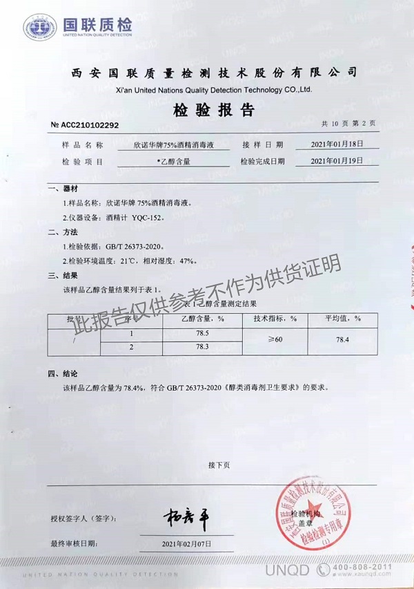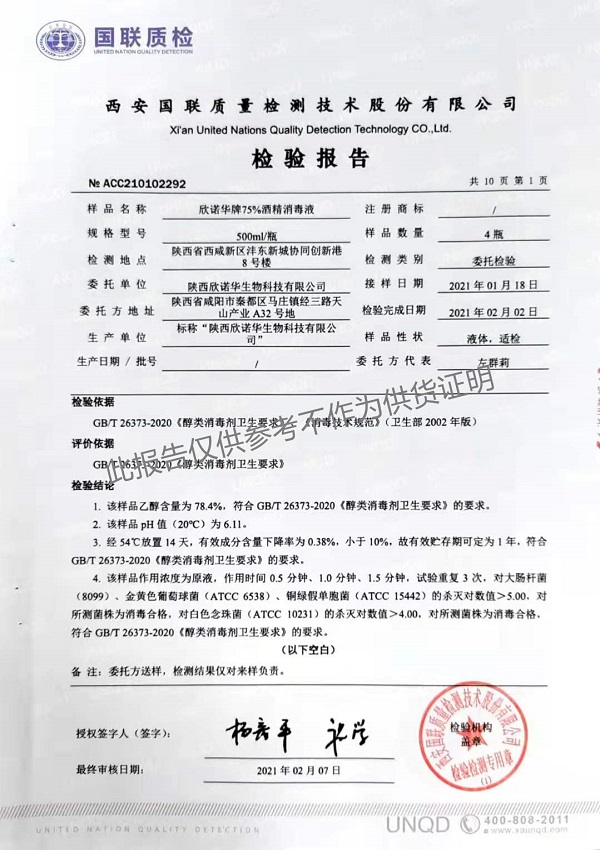 欣諾華牌75%酒精消毒液 檢測報告(2021年度)-陜西欣諾華生物科技有限公司