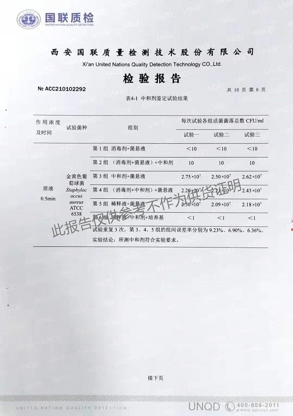 欣諾華牌復合季銨鹽消毒液(XNH100型)檢測報告