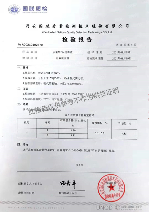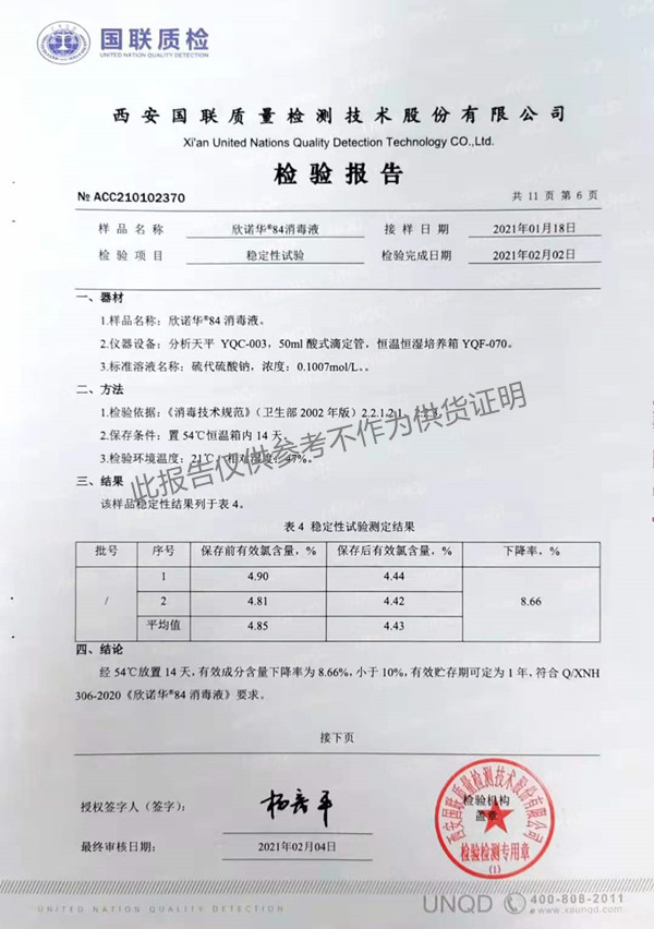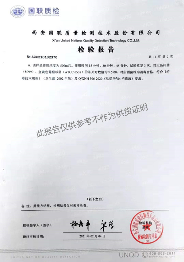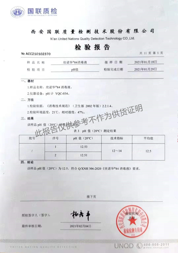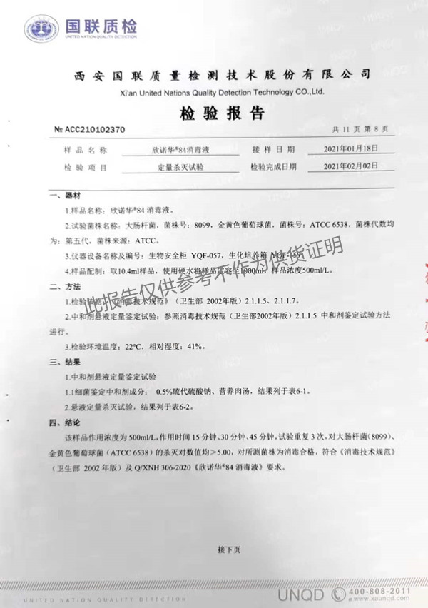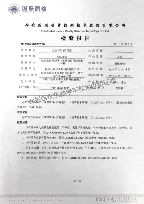 欣諾華84消毒液(XNH306型)檢測(cè)報(bào)告(2021年度)-陜西欣諾華生物科技有限公司