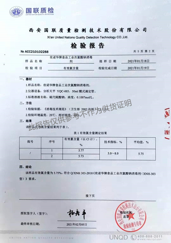 欣諾華牌食品工業(yè)次氯酸鈉消毒劑(XNH303型)檢測報告