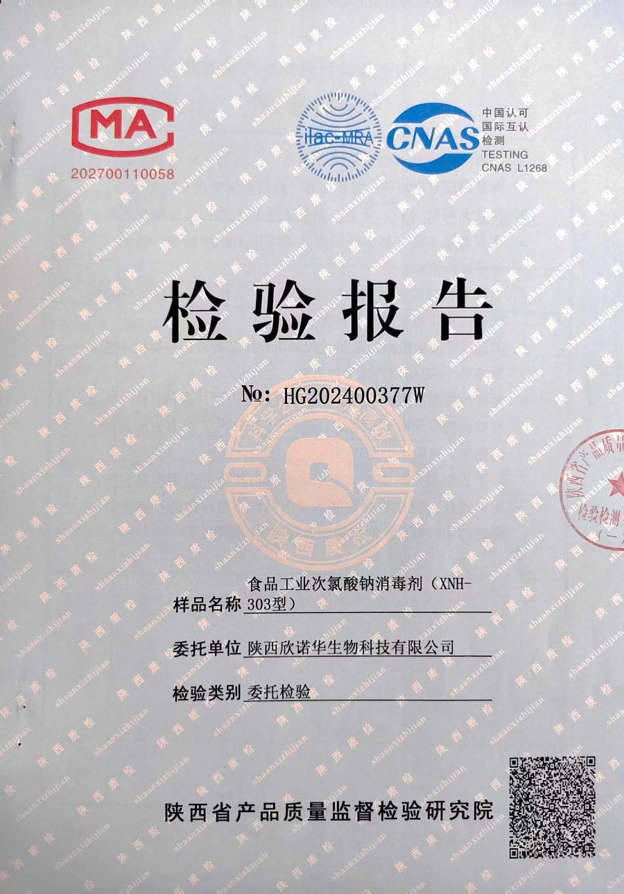 欣諾華牌食品級(jí)次氯酸鈉消毒劑檢測(cè)報(bào)告(XNH303型)(2024年度)-陜西欣諾華生物科技有限公司