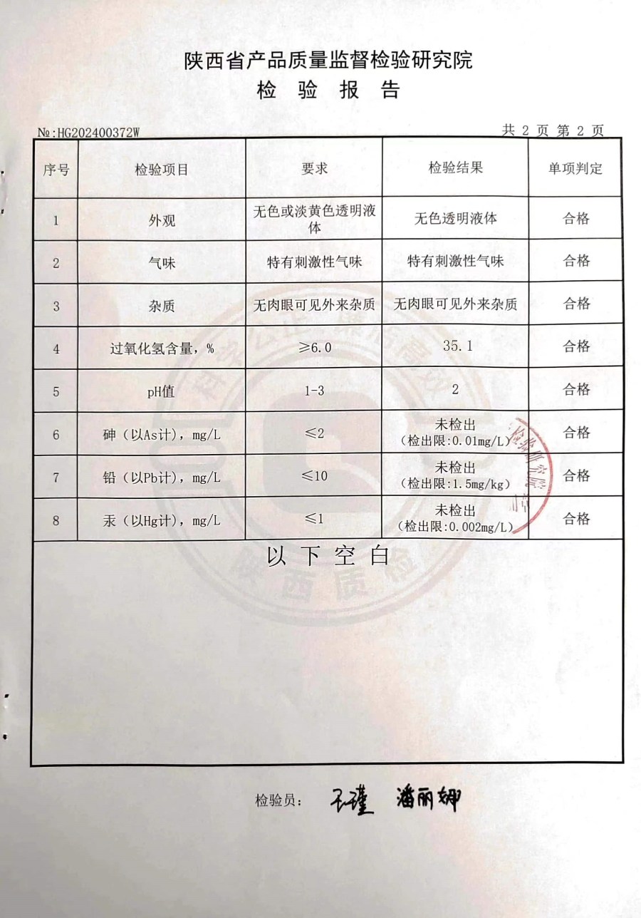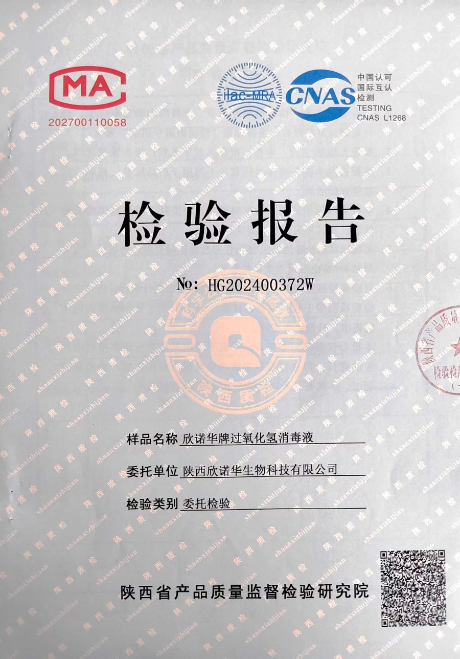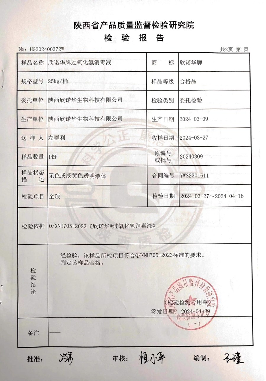 欣諾華牌過(guò)氧化氫消毒液(食品級(jí)雙氧水)檢測(cè)報(bào)告(2024年度)-陜西欣諾華生物科技有限公司