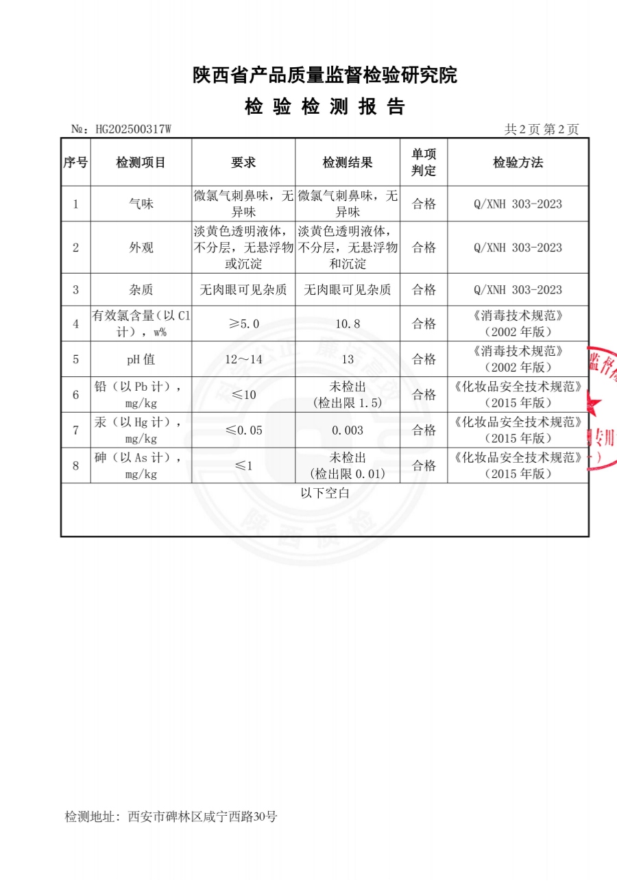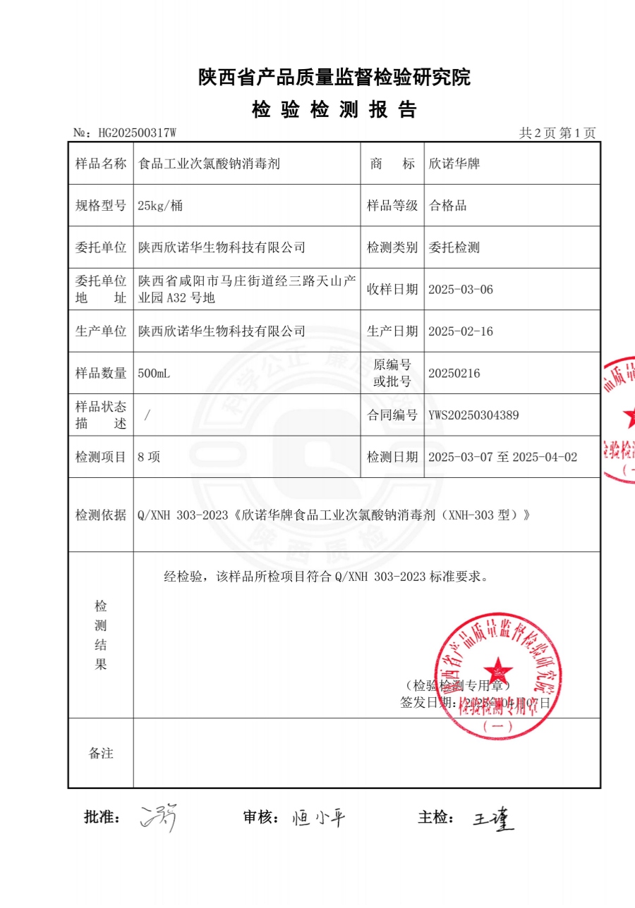 欣諾華牌食品級次氯酸鈉消毒劑檢測報(bào)告(XNH303型)(2025年度)-陜西欣諾華生物科技有限公司