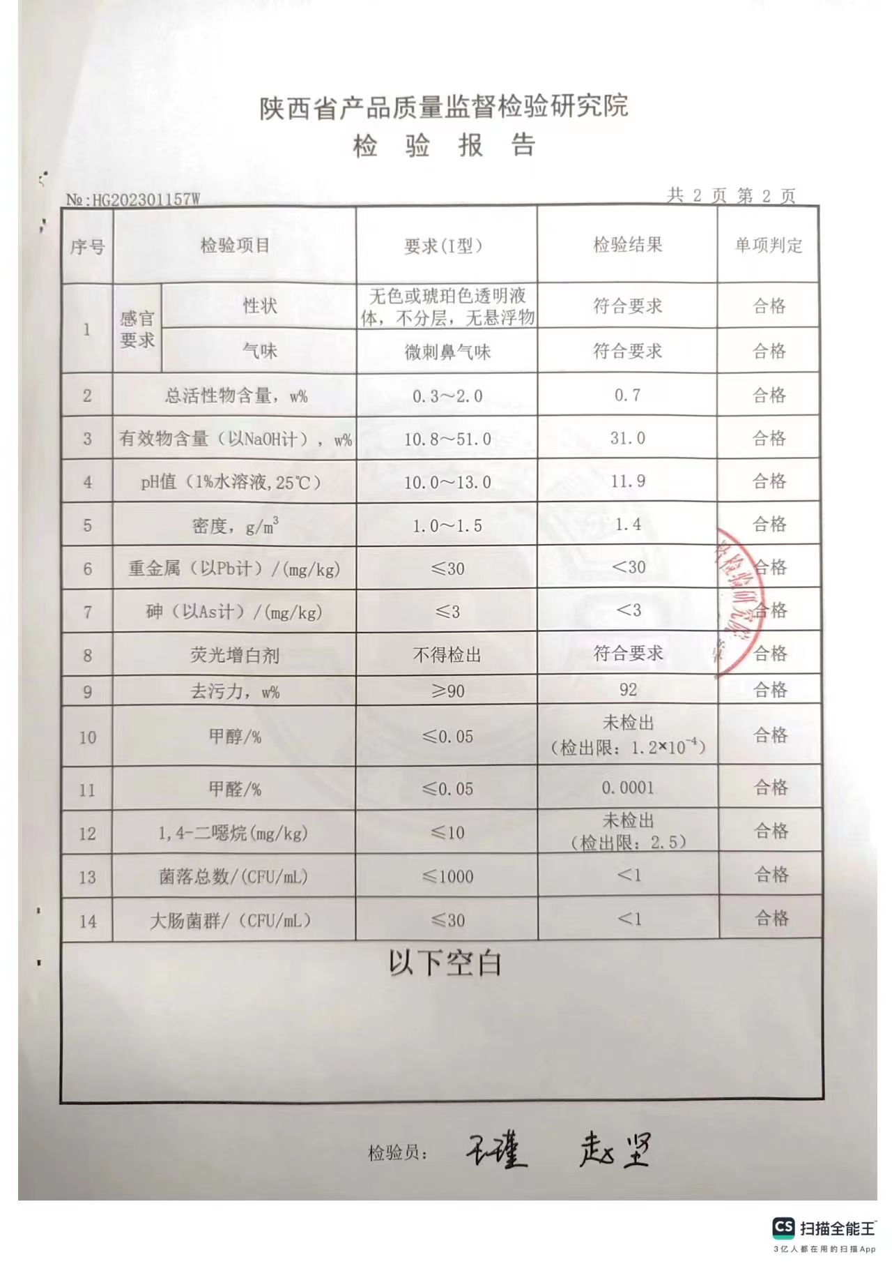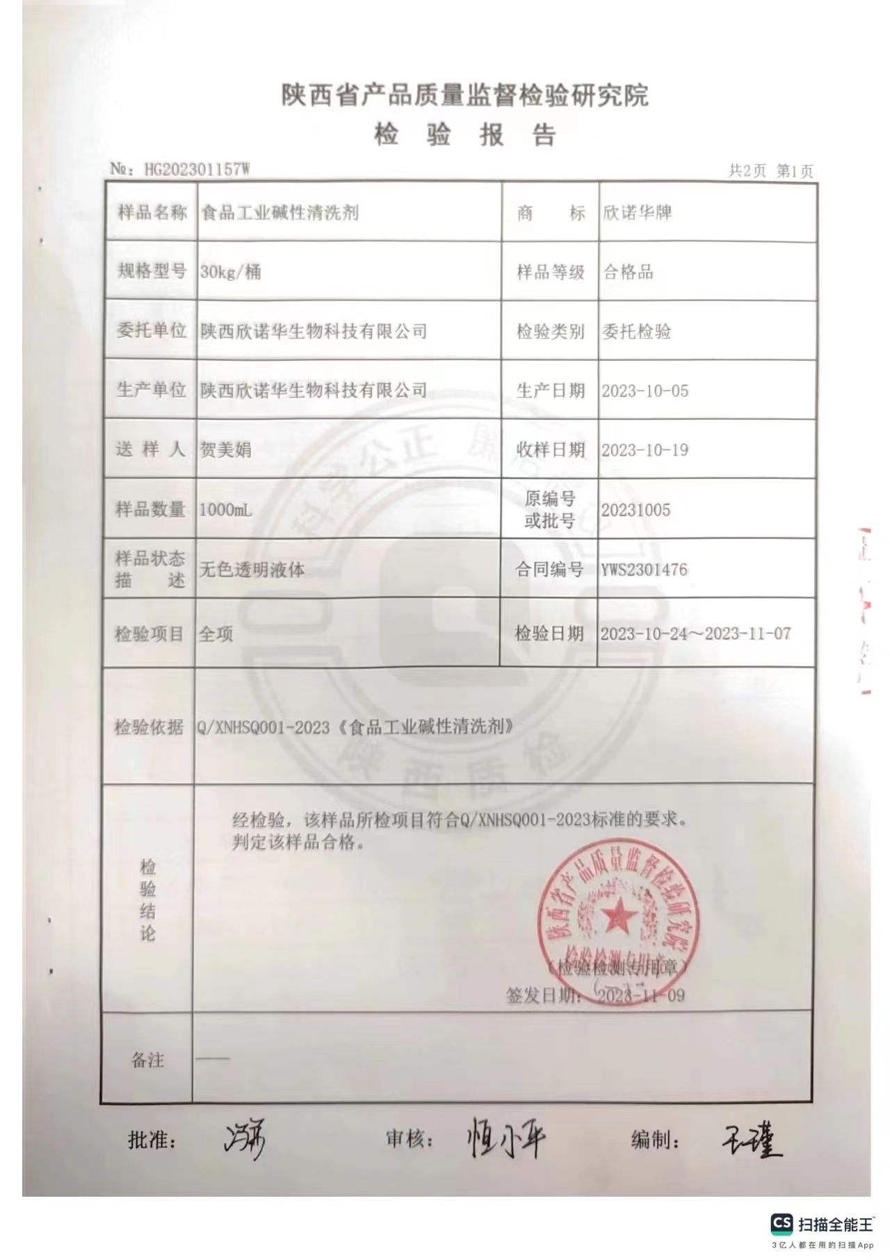 食品工業(yè)堿性清洗劑檢測(cè)報(bào)告(2023年度)-陜西欣諾華生物科技有限公司